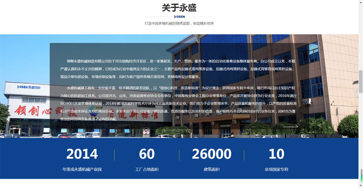 館陶縣永盛機(jī)械制造有限公司成立于1991年,前身館陶永興機(jī)械廠,坐落在“中國(guó)蛋雞之鄉(xiāng)”河北館陶,是一家集科研、設(shè)計(jì)、制造、銷售于一體的***生產(chǎn)畜牧機(jī)械、飼料機(jī)械、養(yǎng)殖成套設(shè)備的企業(yè)。公司位于309與106國(guó)道的交匯處,北臨青蘭高速,西臨大廣高速,南臨邯濟(jì)鐵路,交通便利...