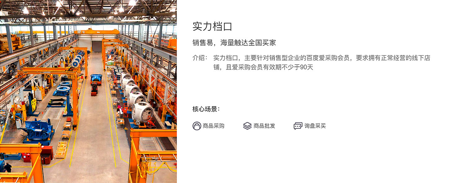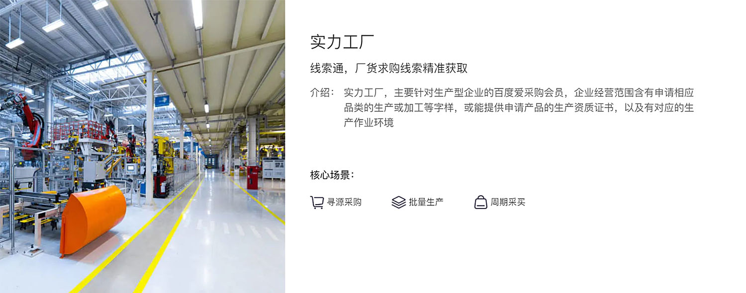 主要針對(duì)生產(chǎn)型企業(yè)的百度愛采購(gòu)會(huì)員,企業(yè)經(jīng)營(yíng)范圍含有申請(qǐng)相應(yīng)品類的生產(chǎn)或加工等字樣,或能提供申請(qǐng)產(chǎn)品的生產(chǎn)資質(zhì)證書,以及有對(duì)應(yīng)的生產(chǎn)作業(yè)環(huán)境